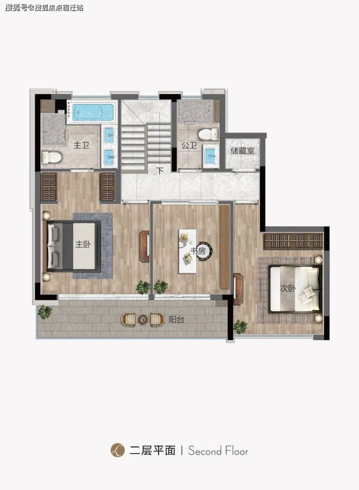二层空间同样打造了约7.2米长阳台,二层设置了一个豪华套房主卧,以及一个次卧、一个书房以及公卫连通开间约4.2米的主卧与开放式书房,即使起居在二层,南向外接宽境阳台,可以眺望小区的园林美景。