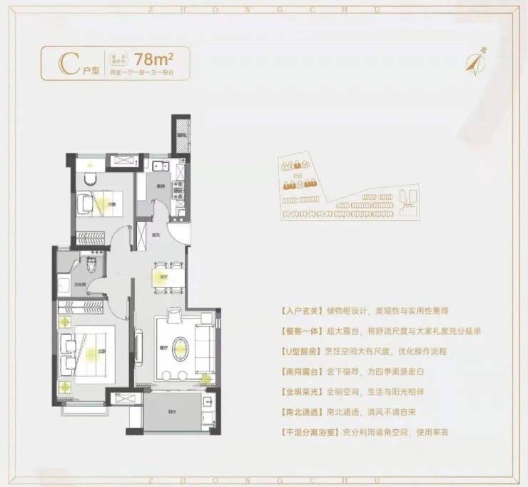 洋房总高8层,建筑面积约55-89㎡1-3房,精装交付,共计176套,有4个主力户型,包括建面约55、56㎡1房,78㎡2房,89㎡3房。