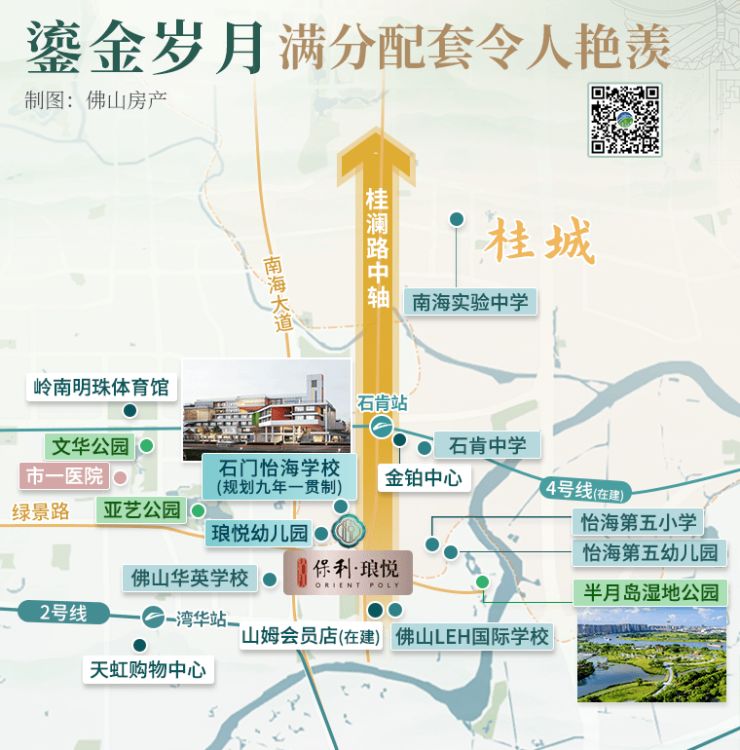 教育资源具有“确定性”,自身配建的15班幼儿园已于2024年动工,与一桥之隔的石门怡海学校(24班小学+36班初中)形成“目送式教育闭环”,该校由石门中学直接管理,2026年开学后将成为桂城公办教育新标杆。周边3公里范围内更聚集怡海五小(省一级)、桂华中学(市重点)等7所优质学校,构建从幼儿园到高中的12年教育资源。