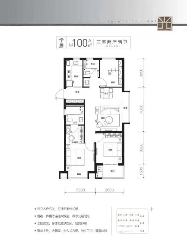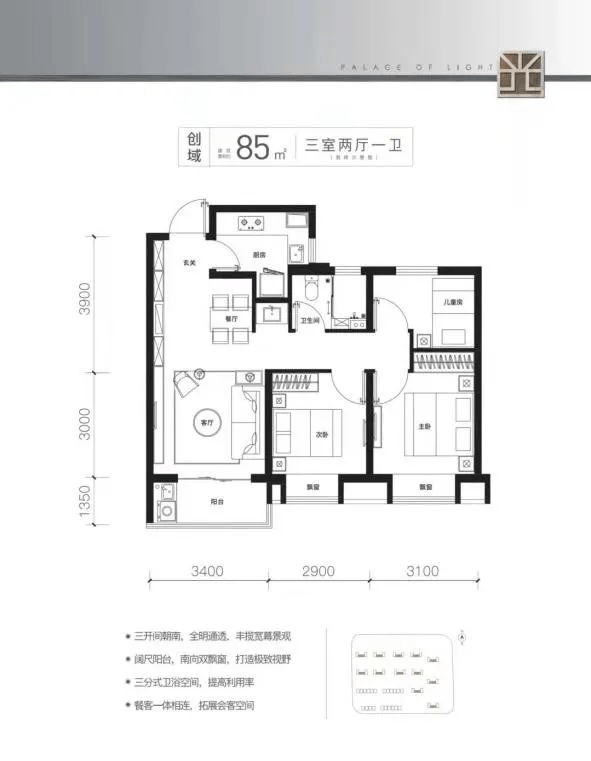 这是边套户型,三面采光是最大的亮点,在有限的空间内打造了三室两厅两卫,并且在一期的基础上进行了升级,扩大了飘窗的空间,满足购房者对舒适度和功能性的两大追求