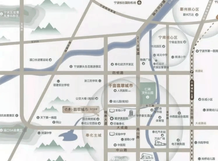本项目东邻锦奉大道上,东靠214省道,西靠锦奉路,南至大成路,北接四明路,向东毗邻奉化万达、银泰商圈(驱车约10分钟即可到达奉化核心商圈),大成路、长汀路快速通达机场高架及地铁3号线,通过多维度的交通配套设施加持,即可实现与宁波主城区半小时的通勤生活圈