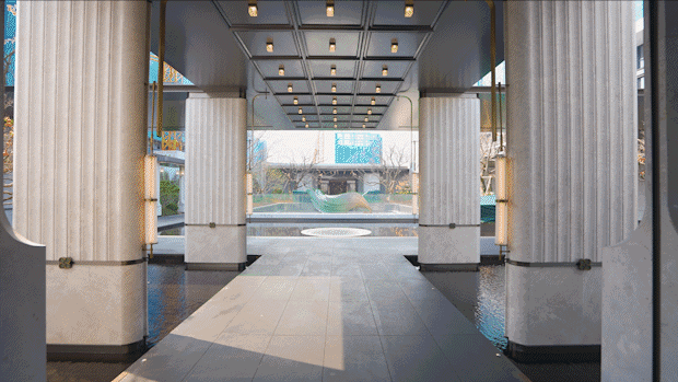 门厅上:采用高奢酒店“环岛式”落客流线,配有胡栋民先生操刀,从约1500公里外臻选的汉白玉整石雕琢而成的《海·回声》,墙面、地面采用奢石铺就。