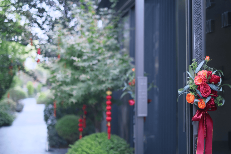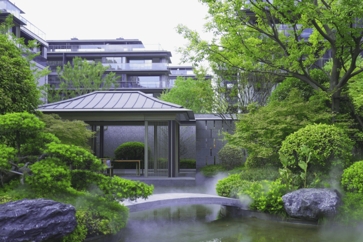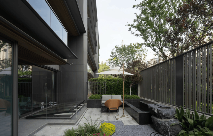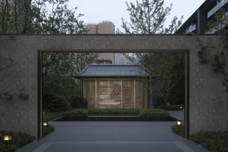 步入巷道谧径,高低错落的花木绿植围合起私密的门庭,单元入户门栅提取汉阳树银杏纹样,无声叙述着这片土地的历史底蕴。推门即是私家庭院,户户实现独门独院、私梯直达内宅,颇具名仕家族的隐逸之风。