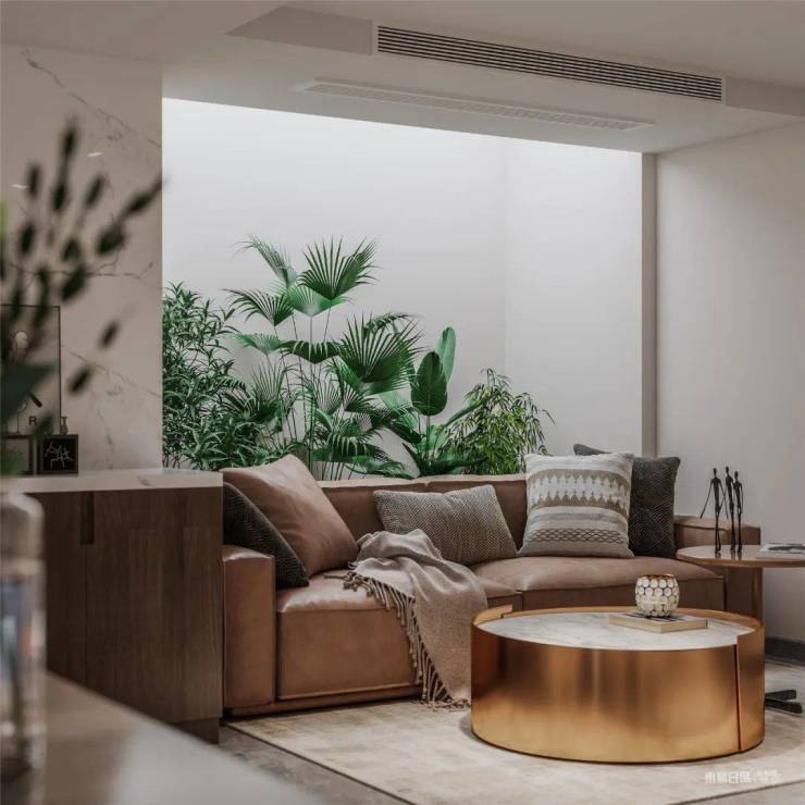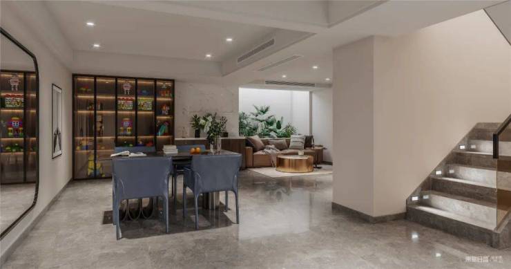 步入地下一层,餐厅与客厅相通,沙发背后的竖井景观,让整个家的空气都变得通透明亮清新。家具都是沉稳的咖色系,给居者一种舒适高级的感受,打开通顶展示柜中的灯,亮度和氛围直接拉满,让空间看起来更加的质感大气。
