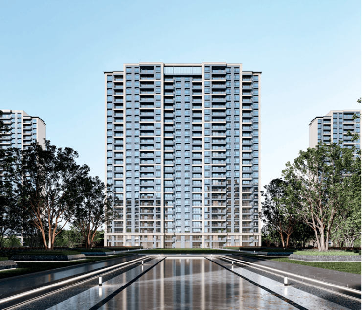 超宽楼距—楼间距最宽处达约70m,北侧楼栋视野可达约500米,城市天际线开阔。