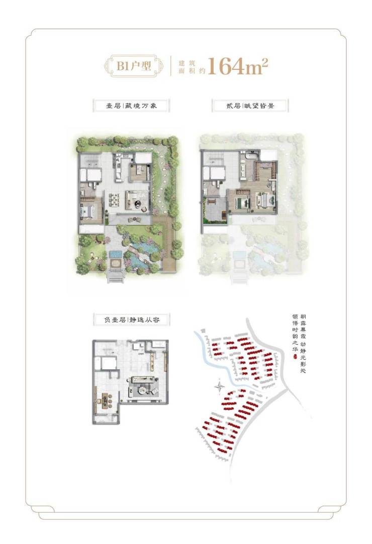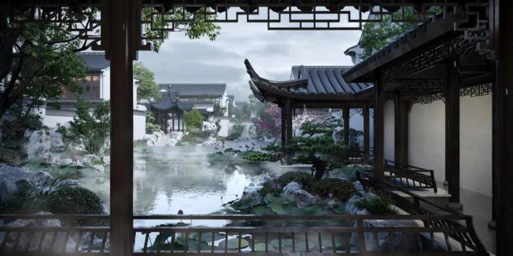外部生态环境有多优越,自不用再多赘述。更值得关注的是项目的内里,项目与周边低密生态环境的一脉相承,对标古镇中式风格,在文脉传承和风格打造上的天衣无缝。