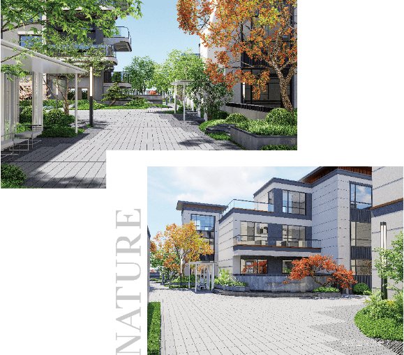 以一轴两区分割画面,辅以小景穿插巷间,通过矮枫、造型松等塑造小景,融合中式文化意境。以樱、桂等乔木为主景穿插巷间,融入现代风情;漫步巷间,一步一美景,一花一世界。环社区一衣带水,倚水而立,吸纳天地精华,离尘不离城。