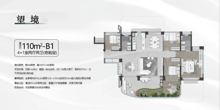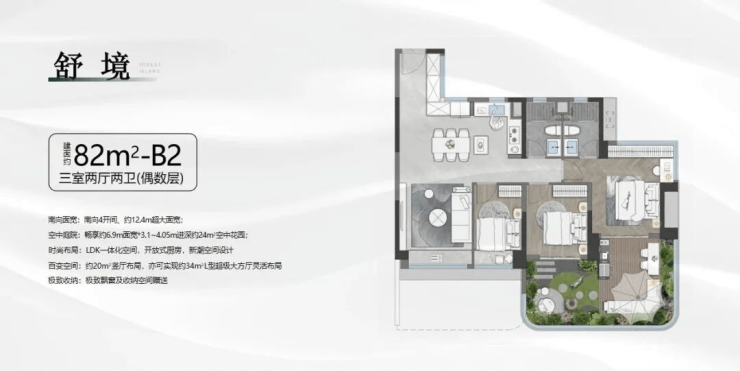 采用围合式布局,形成中央大园林,每户南向采光,部分楼栋可望河景,社区还设有全龄化景观架空层、度假泳池、儿童游乐区等配套设施。