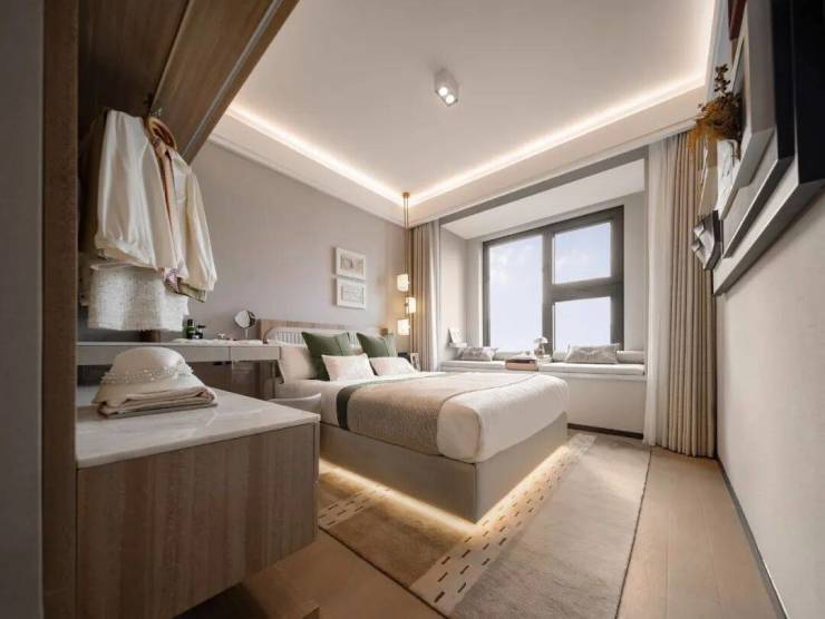 主卧套房设计,隐私性较好,飘窗设计更有效延伸室内空间,也可以作为休闲区域使用,收纳空间也比较充足,切实考虑年轻人买买买的购物习惯。