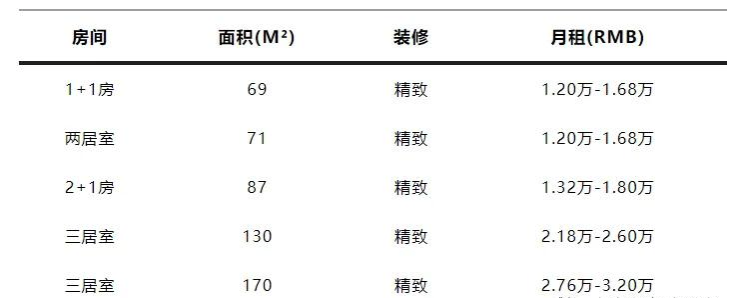 租金包含:物业、发票、宽带WiFi、每周2次打扫1次换洗布草、健身房等公区使用、24小时管家及安保服务;停车第一台800元/月,第二台1200元/月;可养宠物(需押金及清洁费)。