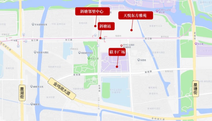 距金鸡湖东岸约1.5km,北邻十里斜塘母亲河,依水而居,环境优越;