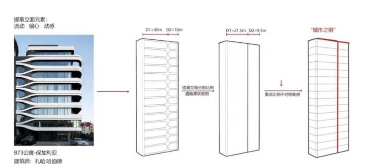 建筑造型现代简约,黄金比例分割,尽显不对称美感,充分体现尊贵感,经典大气。立面设计灵感取自建筑大师扎哈·哈迪德,流动曲面与挺拔线条的运用描绘出义乌首个“柔性OLED圆角美学流体建筑”。