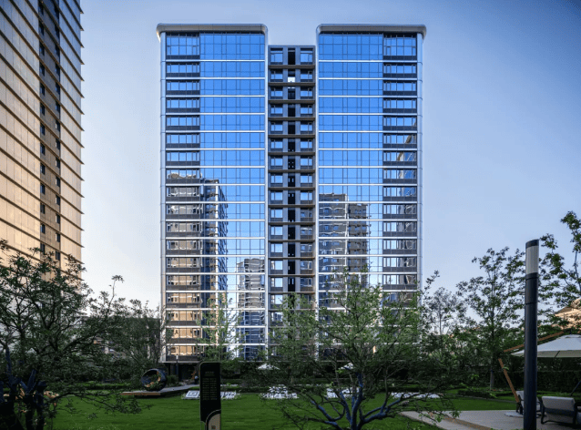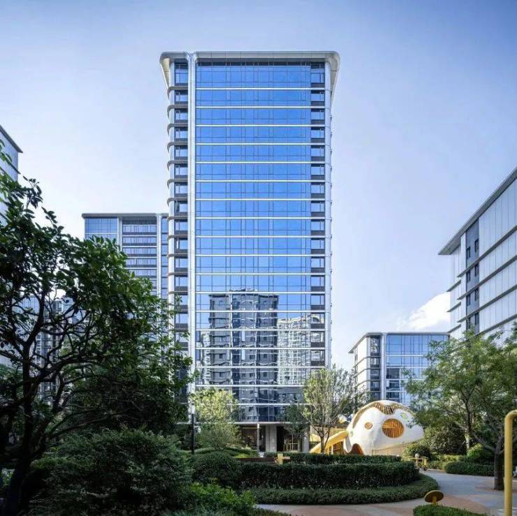 九樾府与周边城市界面及山水资源相互映衬、接近1:1的超高窗墙比则塑造出傲立于城市的地标态度。