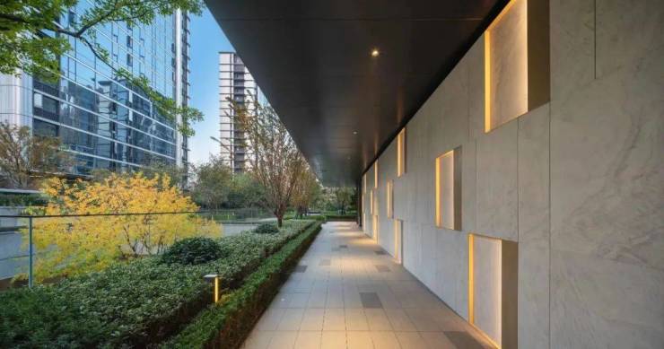 穿过归家大堂,便是漫享悠闲的风雨连廊,长达20米的形象景墙壁画,与定制香槟金金属板有机排列组合保证遮风挡雨的效果外,也能漫赏灯光带来的尊贵感。
