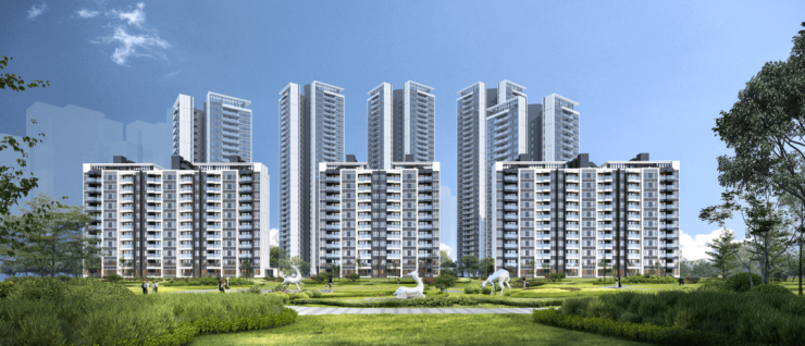 在立面设计上通过过体量生成、体块划分、端部收分、格构设计及材料的赋予,利用现代、简约的建筑设计手法,以体块穿插为主,结合“框”的概念及虚实关系的处理,形成格林水岸项目的整体立面设计。再在顶部利用北欧建筑的穿插立面手法,凸显格林风格。