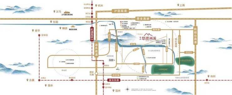 项目近享磐安老城和高铁新城双重资源配套,诸永高速、甬今高速、杭绍台高速、金台铁路及杭温高铁磐安站(2024建成)等环伺周边,从项目出发,到宁波、温州、金华,义乌等都市皆十分便捷,也将是直通杭州大湾区、杭州大都市区及国际大都市上海的便捷通道。