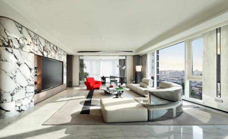 另一方面源于海潮望月城天生的传代属性——譬如我那天去参观的湖印5号楼,从公区到室内,基本都被石材覆盖,前后使用到不下10种名贵进口大理石,大理石的名字就可罗列出一长条,并且每一种都安放对位置,做到石材与空间的相互辉映。