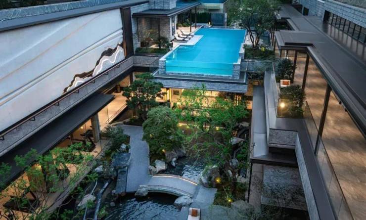 悬挑泳池尤为让人瞩目,创新设计江南岸首个悬挑式无边际泳池,搭配流水幕帘与青玉雕刻的“聚宝盆”,水流潺潺间,不仅度假氛围浓郁,蕴含“吉祥美好”的寓意。