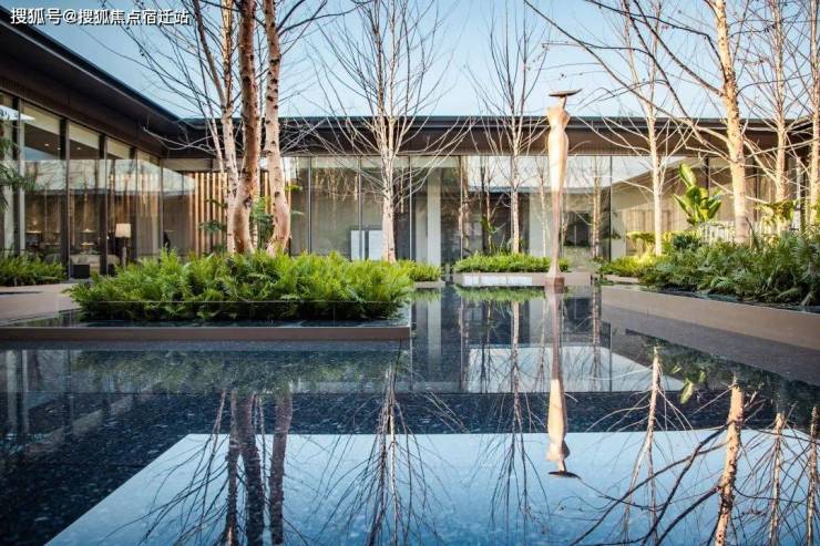 第二进珠翠回廊内,墙体选择的是美国白麻石作为基色,作为世界高端花岗岩石种之一,充分彰显改善人居的奢华品味。并以水面森林为主体,种植大量美国鲑鱼粉河桦树阵,金钱草、迷迭香、笔筒树等林下植被,让归家的尊贵与仪式感应然而生。