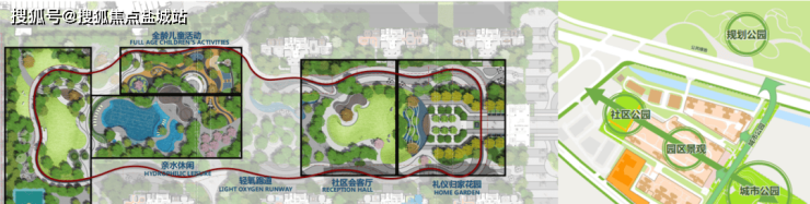 地块引入城市公园和社区公园,直面城市公园的青年社区,城市公园串联三个住宅区块:引入青年运动,儿童乐园,老年活动和公园商业概念;社区公园设有运动、老年活动等让每个区块能够实现共享实用。