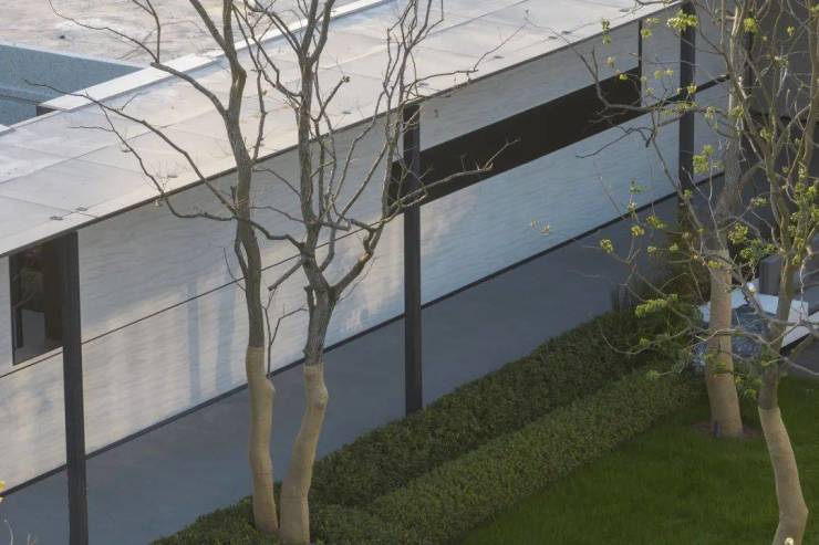 整个中庭背景立面简洁干净统一,水景墙设计语言延续统一建筑立面,同时也是售楼处入口观赏的最佳点位;