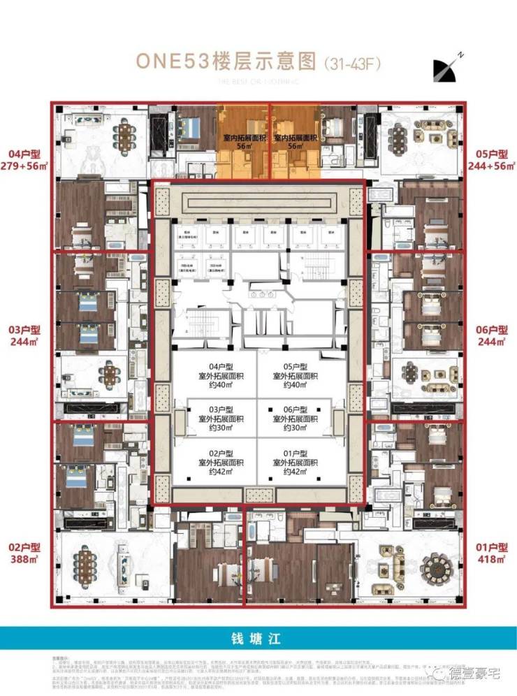 稀缺江景资源:主力户型244-438㎡,高区单元可270°瞰江,部分房源直面奥体“莲花碗”灯光秀