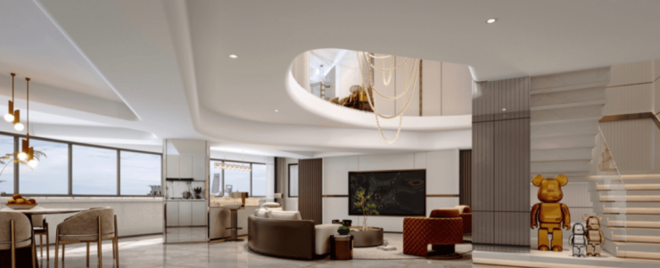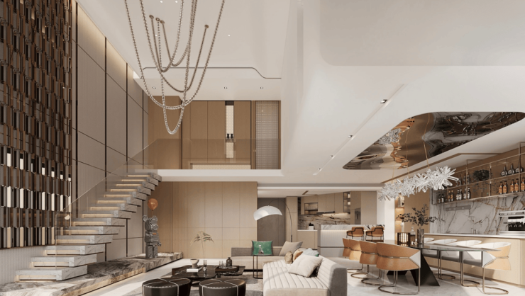 奢阔宽厅,大面积玻璃寰幕墙映衬繁华街景,客厅挑空设计,更具空间感的大气朗阔感受,吧台连接陈列展示区,增添优雅的层峯底色,独立卧室层,三间套房奢华配置,尊享静谧。