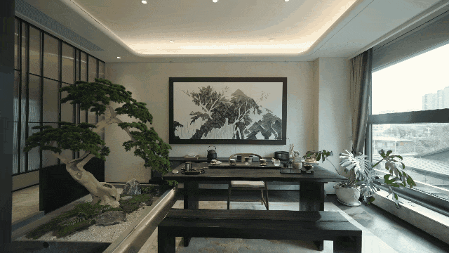 320样板房,以“海派东方”为设计之源,在传统文化与海派精神整体交汇的风格中,融入屏风、雕花、水墨等中式元素,传递东方美学的优雅浓缩。在“空中院落”,或琴棋书画,或诗酒花茶,品味人生八雅之乐;转身之间,约21.4米横向IMAX大面宽,让风景与光线的双重盛宴连绵入目。