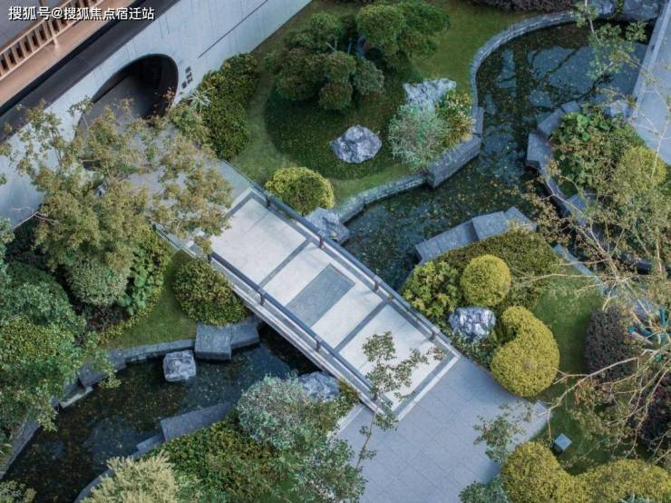 ”约930㎡礼仪园,表达“入园以礼相迎”之意,对称设计,罗汉松、卧石组成“两松定石”之境,将“石冠群山”、“砚国明珠”的歙砚造型居其中,给予业主生活无限的仪式感与尊贵感。