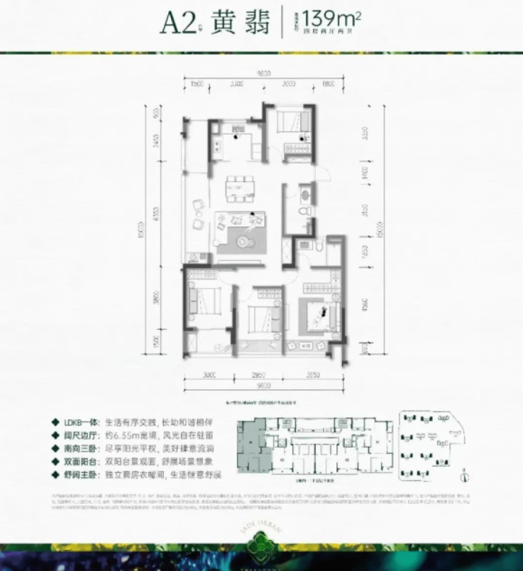 A户型:约139㎡户型,四房两厅两卫,三开间朝南,全明边厅设计,大横厅带大阳台,采光视野好;三个卧室均朝南,带阳台或飘窗,面宽大、采光好;主卧大套间、阔绰收纳空间。是绿城过往的项目中难以见到的。餐客厅一体,连带一个约6.35m左右阳台,景观视野堪称一流。