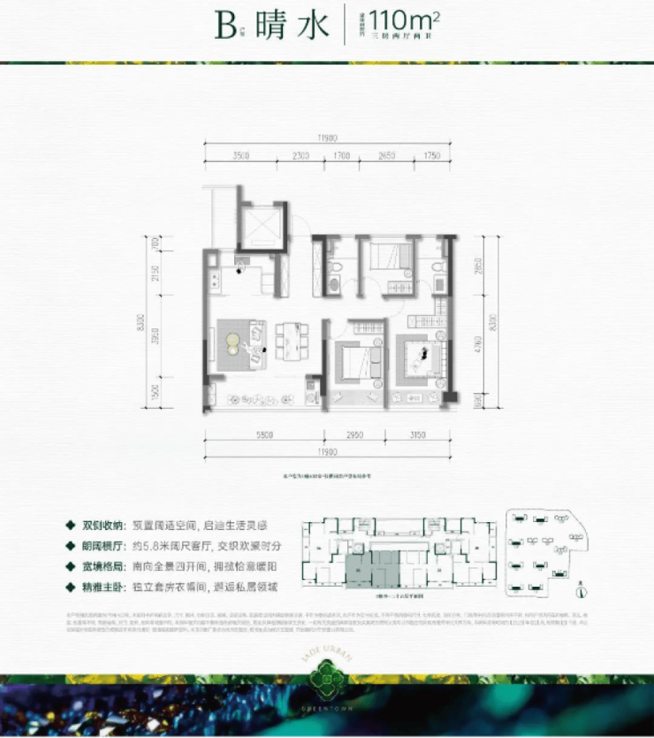 B户型:建面约110方设计了很少见的四开间朝南,南向面宽约11.9米;更为奢侈的是5米8的餐客厅。更何况,约5.8米宽大阳台、双飘窗、U型厨房、主卧套房等,110方户型是一样都没有落下。如此阔绰的尺度,硬生生的设计成了阳光小豪宅。