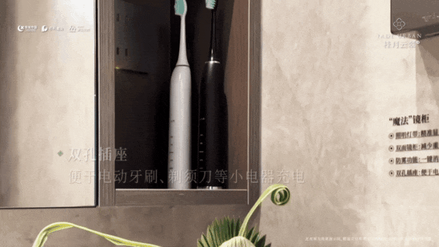 ◈主卫“魔法”镜柜:双面镜柜,主镜防雾膜+灯带,美妆更清晰;双孔插座,便于电动牙刷、剃须刀等使用。