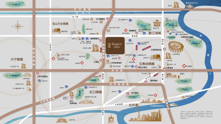 生活配套非常成熟,新业坊·源创就在西侧,吃喝玩乐都能满足,潮流、精致元素也为板块注入更多活力。殷高西路上还有永辉、长江国际、景瑞生活广场等商业。如果要大商圈,项目自驾到五角场商圈、宝山万达、悠方购物中心、大宁商圈、虹口龙之梦也十分便捷。