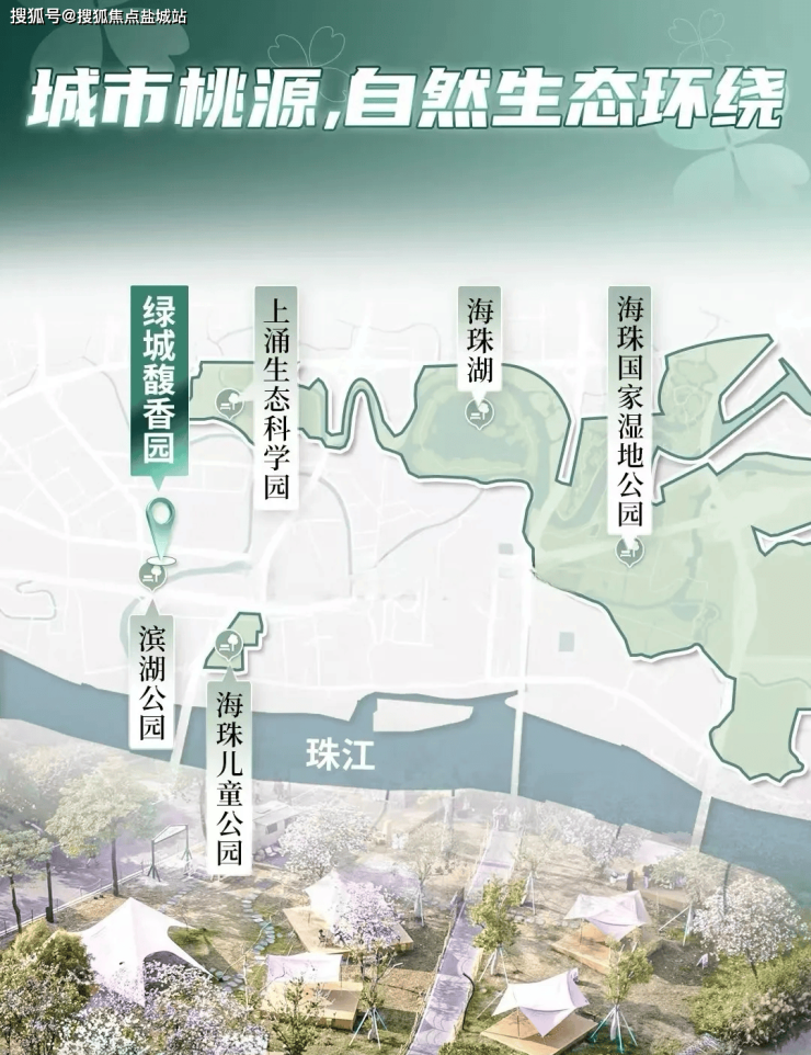 从外部来看,项目背靠河涌,打造了一个滨河公园,与周边的海珠儿童公园、海珠湖、海珠国家湿地等,形成了巨大的天然的生态背景板。
