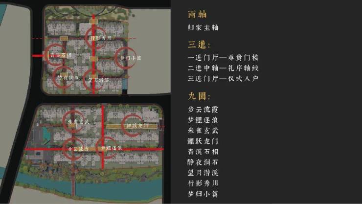 遵循府第规仪,演绎景观节点,中轴、庭院、园林等层层递进,三进九园赋新隐山望族仪式生活。
