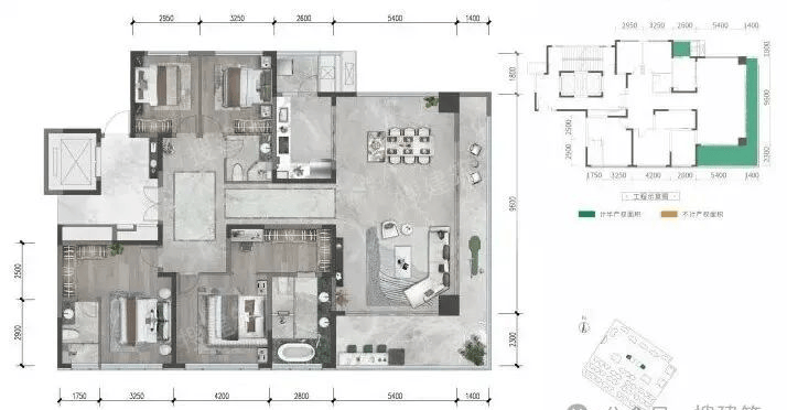重点说一下建面约332㎡户型,设计突破创新,设计了两梯两户的270°全景天幕视野,层高约3.6米,还有私家泳池设计!