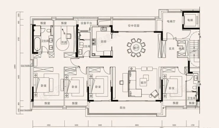 建面约300㎡户型最吸睛的是270°的落地窗围塑约110㎡的剧场式端厅,约3.5米层高,达到宫殿级别的视野。
