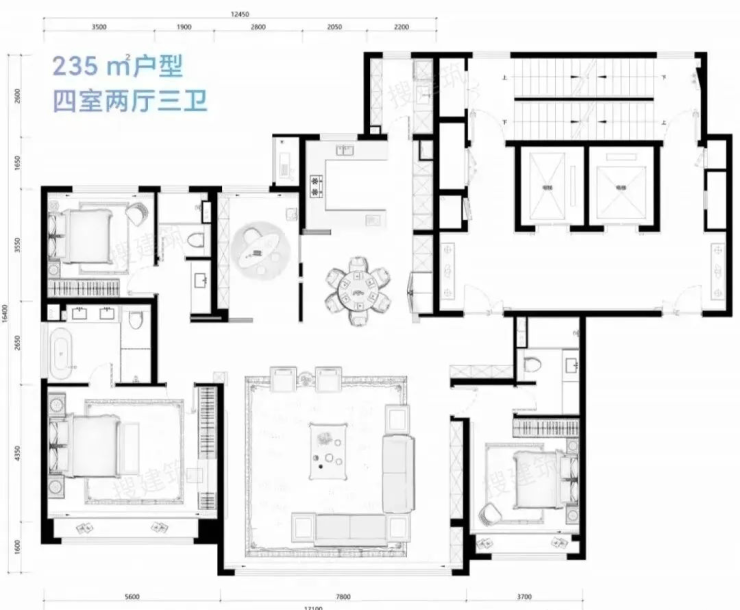 先来看一下建面约225㎡的户型,四室三厅三卫设计,270°宽景转角端厅、双开门入户、独立入户玄关、创新多功能厅等设计。