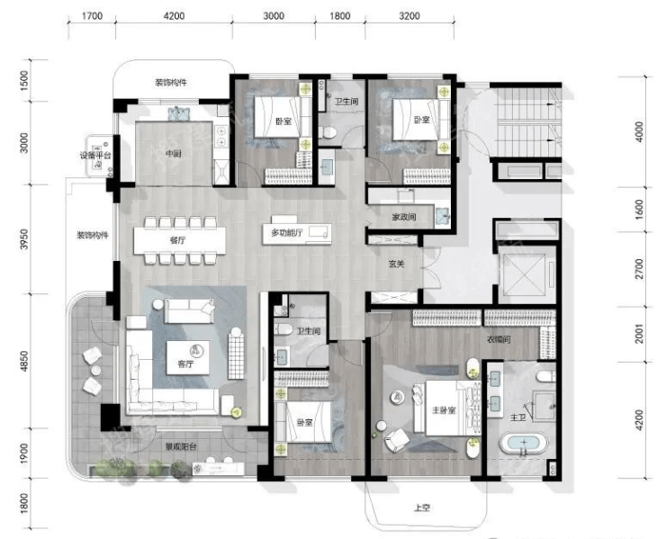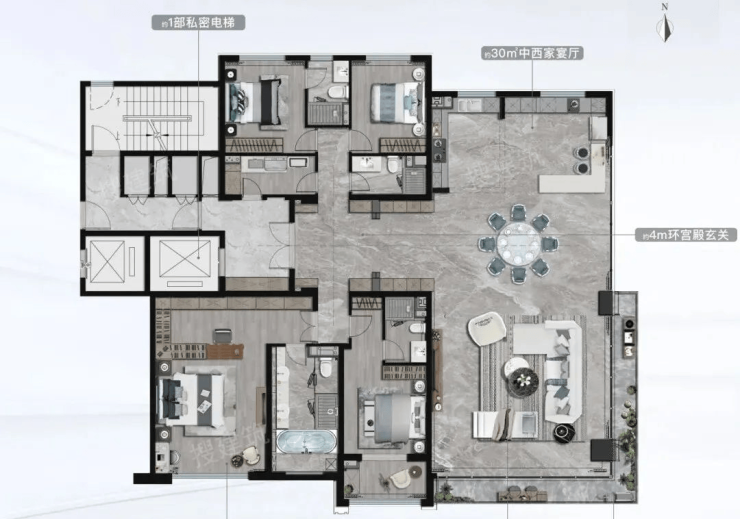 比如成都·锦江赋建面约241㎡户型,四室两厅三卫,女王玄关,270度环形天幕景观阳台,连接客餐厅,营造出雅致的奢适与大气的尺度感
