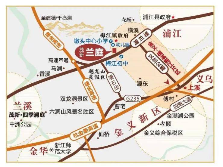 梅江地处兰溪北大门,是义兰同城发展的核芯区,近年来,谋划启动了重点项目60余个,总投资40余亿元,招引亿元以上项目15个,义兰电商产业园、冷链物流等一批优质项目先后落地。截至2023年梅江引进企业200家,含29家规上企业,总人口数量达4.2万人。梅江持续瞄准“融义入杭”新坐标,将引入重大产业,实现全面发展。梅江人居标杆茂新兰庭,地处核芯居住区,将共同见证梅江腾飞。(来源:金华日报)
