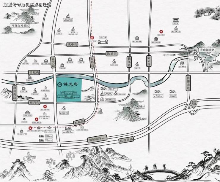 锦天府择址临安锦城、锦南繁华交汇处,东靠狮子山,与吴越街为邻,杨岱溪贯穿园区,犹如玉带环腰,左右逢源