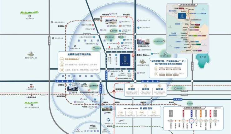 距众禾嘉苑仅一站的丰茂路站,即为一主二辅枢纽体系中的嘉定东枢纽,是嘉闵线、宝嘉线的换乘站,可为新城提供直达苏锡常的大容量、高可靠公共交通服务,是嘉定新城最具潜力的核心引擎。
