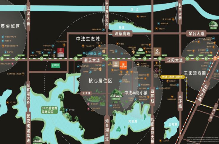 商业配套:项目A、B、G地块均包含部分临街商业。附近有在建的蔡甸吾悦广场,体量约10万方,直线距离仅500多米。其次就是蔡甸城区的中核世纪广场和周边的小区底商。王家湾商圈距离超过10公里,但出行比较便捷也算是较为方便的配套。