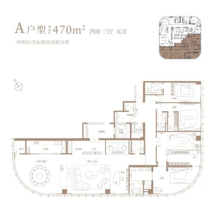 [凌云]——建面约558㎡阔厅户型,以五房三厅六卫诠释层峰的高雅生活场。超豪华联厅,禅意于无形,练就全球生活家的社交舞台。