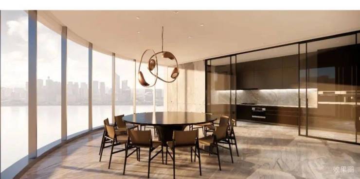 开放式中西餐厅是天然的派对厅,光影与风景延至室内,餐厅亦可无遮挡瞰江,餐厅围坐,共享家族阖乐,宴飨宾朋,社交聚会从容优雅,别人的向往,是此处的日常。