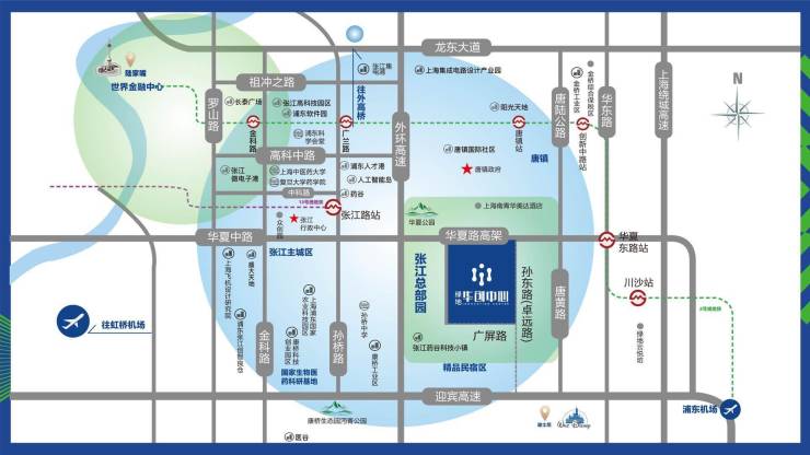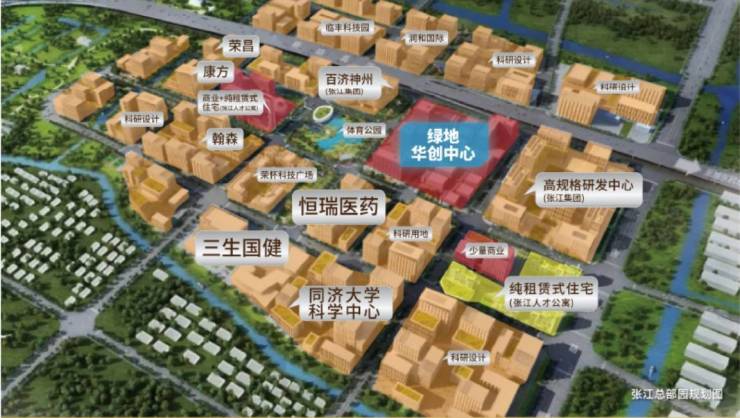 绿地华创中心位于张江高科技产业聚集地-张江总部园核芯区。张江总部园涵盖前端开发、高端制造、商业服务办公等功能,有数十家头部企业、上市公司、独角兽企业聚集。当前恒瑞医药(中国药企top1,全球top 21)、同济大学科学中心(上海市重点项目)、两大高规格研发中心(张江集团)已进驻张江总部园。