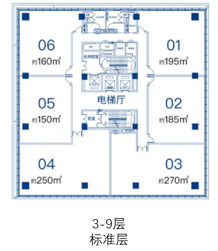 【产品楼层】1层:大堂+商铺;2-9层:办公
