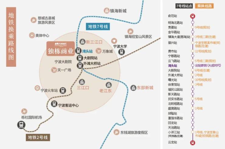 邻城市主脉环城北路,兼得地铁7号线湾头站。7号线连通镇海新城、新三江口、老江东中芯、东部新城、钱湖新城,地铁1-6号线均有接驳换乘站,可快速接运宁波全城消费群体。