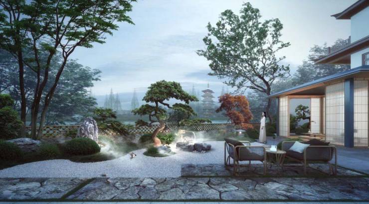 三进归家礼序:月洞门+竹纹景墙+下沉式庭院,复刻《辋川图》中的唐风雅韵;