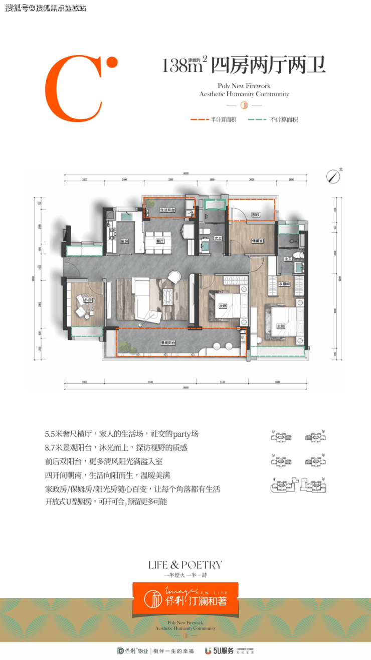 项目户型设计合理,平均得房率高,同等面积多一房,且真正做到了南北通透格局。提供建面约 109㎡三房两厅两卫、120㎡和 138㎡四房两厅两卫三个面积段,满足不同购房群体的需求。大尺度景观阳台、双阳台、可变空间、套房式主卧等前沿设计,让业主享受舒适的居住体验。